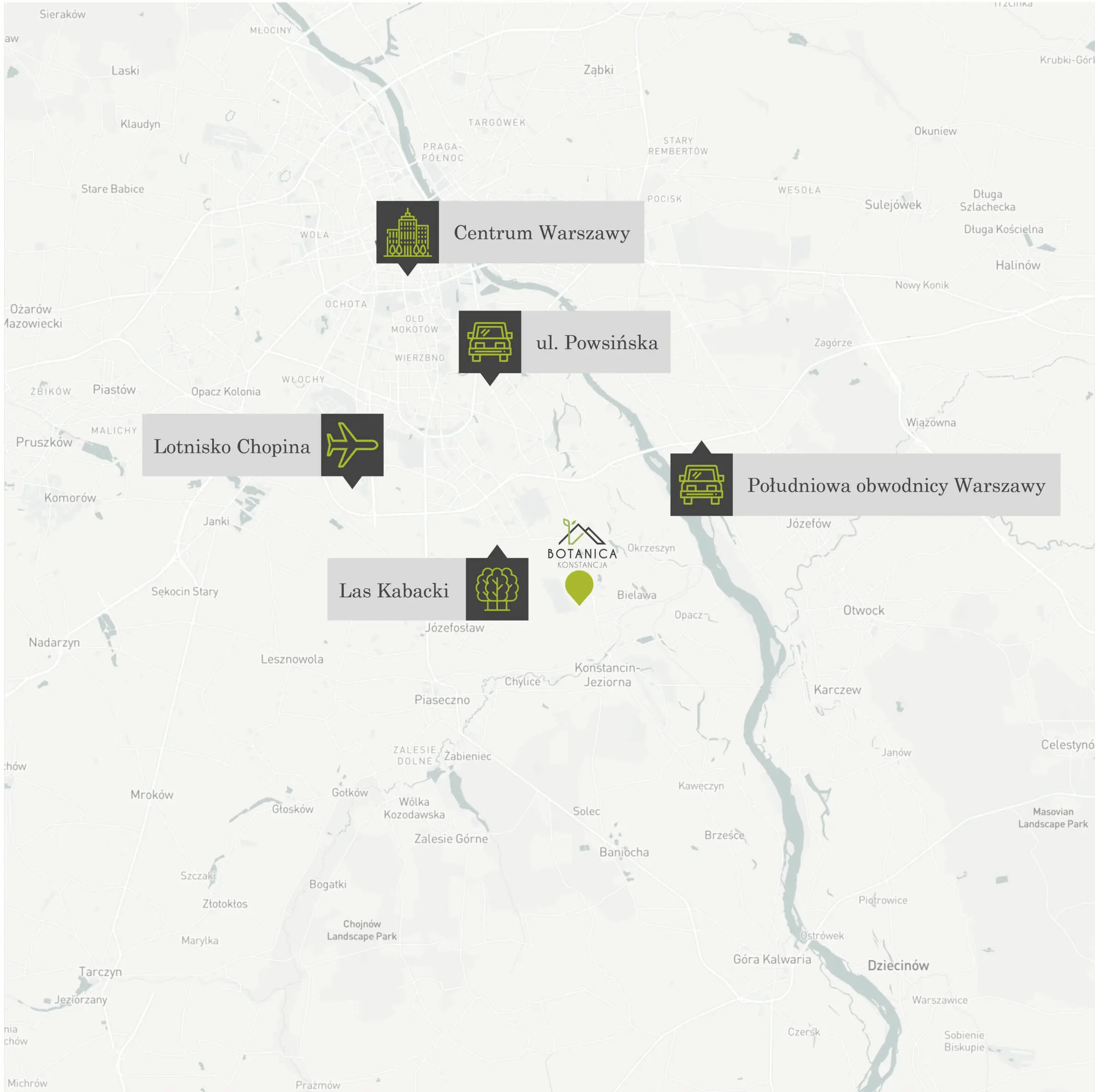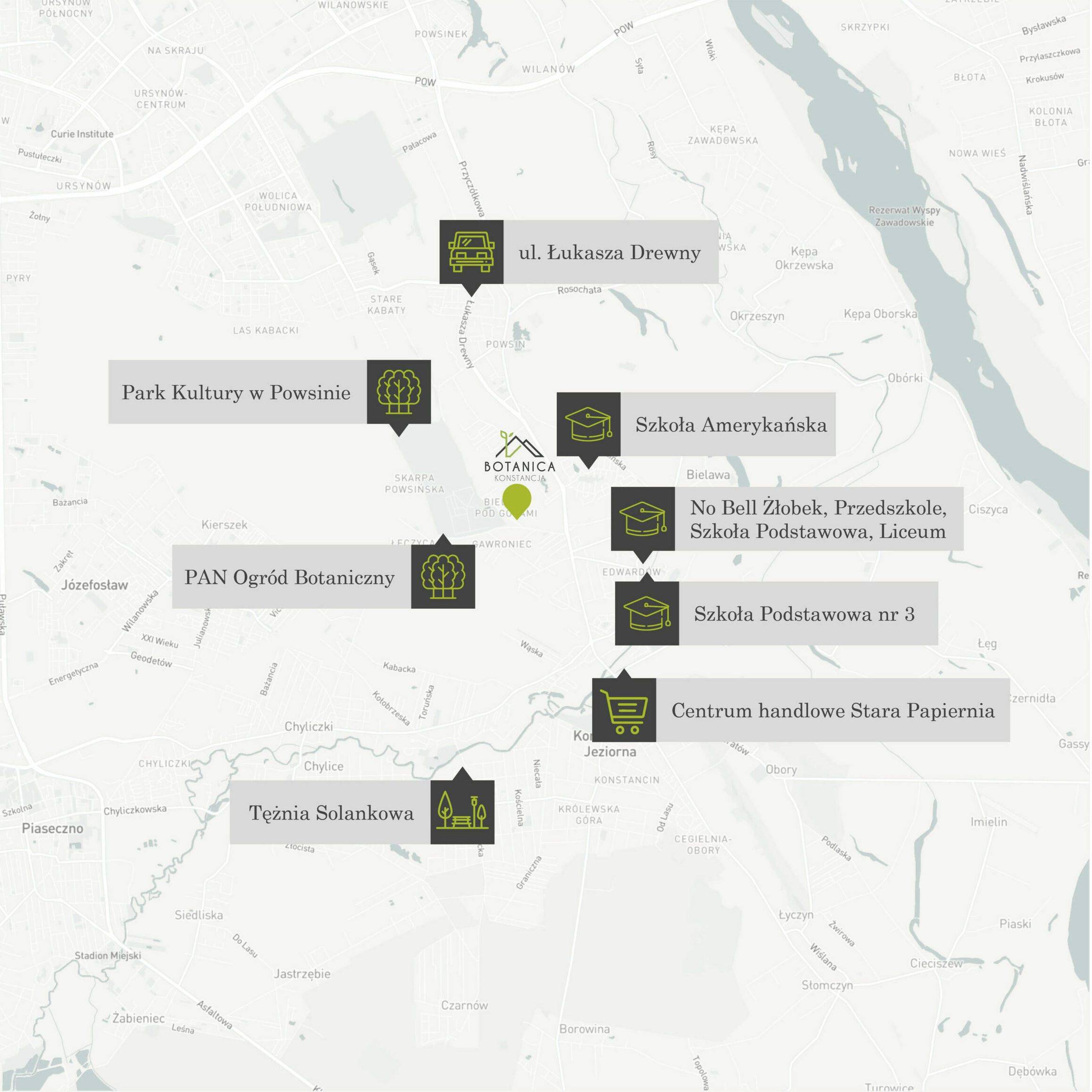 Lokalizacja przy ul. Wczasowej w Konstancinie-Jeziornie stanowi o niewątpliwej atrakcyjności osiedla Botanica Konstancja. Mimo zielonej bariery, chroniącej przed wielkomiejskim hałasem, miejsce to jest znakomicie skomunikowane z pozostałymi dzielnicami stolicy dwupasmową drogą w kierunku centrum miasta. Wystarczy zaledwie półgodzinna przejażdżka, aby znaleźć się w samym sercu Warszawy. Dzięki temu bardzo komfortowo można korzystać z bogatej oferty handlowo-usługowej, kulturalnej, gastronomicznej oraz rozrywkowej stolicy. Niedaleko także Południowa Obwodnica Warszawy, która przybliży mieszkańców jeszcze bardziej do pozostałych regionów Polski i Europy.